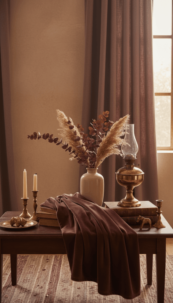 | Burgundy Glow | muted burgundy, wine | brass, cream textiles, walnut | cozy drama, accent walls |