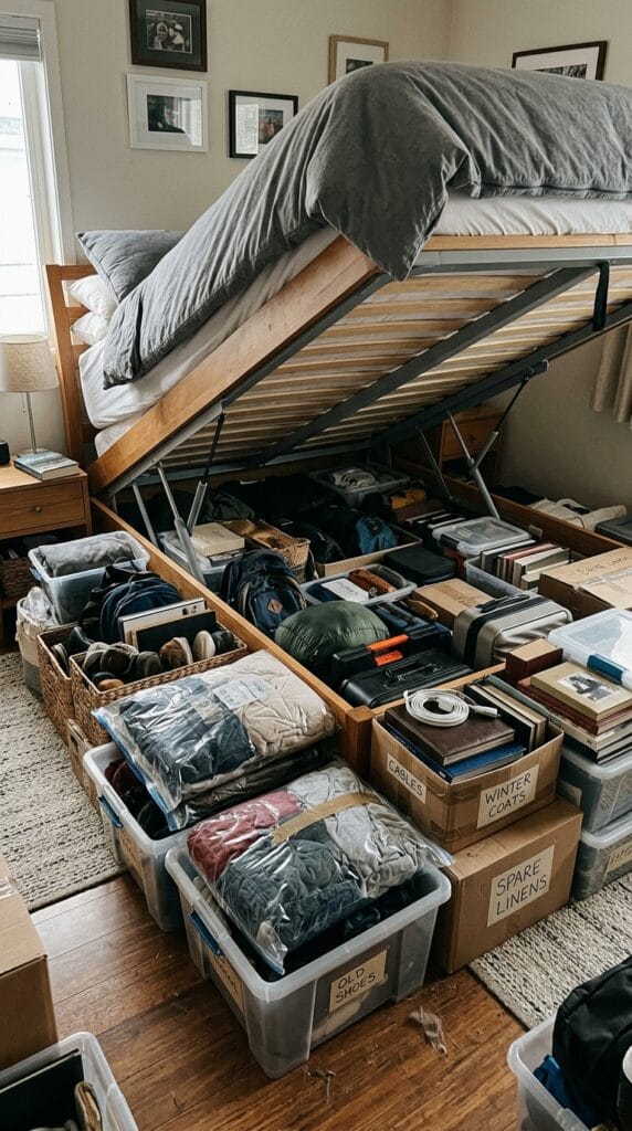 If you’re not using the space under your bed, you’re basically throwing away free storage. I’m not talking about shoving random boxes under there and calling it a day—I’m talking about lift-up bed bases that turn your entire bed into a storage chest.