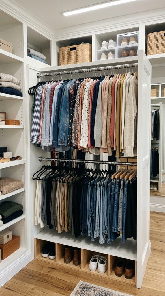 But if you want to go full magician mode, get one of those closet organizer systems with four rods, shelving, bins, and pull-out drawers. I installed one in my closet (took about 30 minutes, no renovation needed), and I swear my clothes quadrupled. It’s like the Mary Poppins bag of closets.