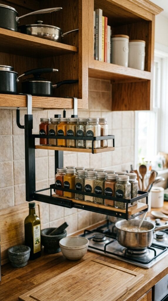 Can we talk about spice chaos for a second? Mine used to be shoved in a drawer like some kind of culinary junk drawer. Now I’ve got an under-shelf spice rack that turns any cabinet into organized spice heaven.