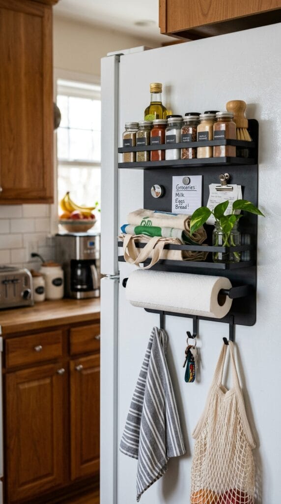 Okay, this one blew my mind when I first saw it. You know how the side of your fridge is just this big, flat wasteland? Slap some heavy-duty magnetic holders on there and boom—instant storage for kids’ cups, spice jars, or even paper towels.