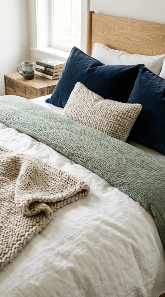 - Accent layer: Wool or knit throw at the foot of the bed