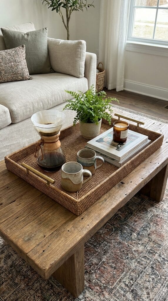 | One “coffee table kit” accessory set (tray + small vase, or basket + faux stems) | $20–$35 | Cluttered surfaces | Coffee table, console | Small accents make a major impact. They make the room feel styled. |