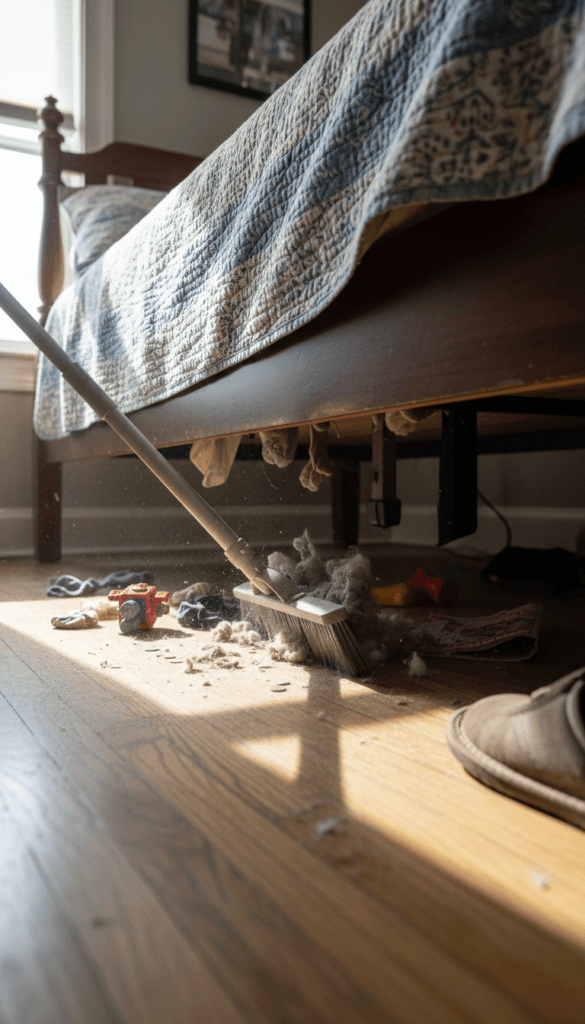 Minutes 35–45: Make the bed and reset the floors (your room suddenly looks human)